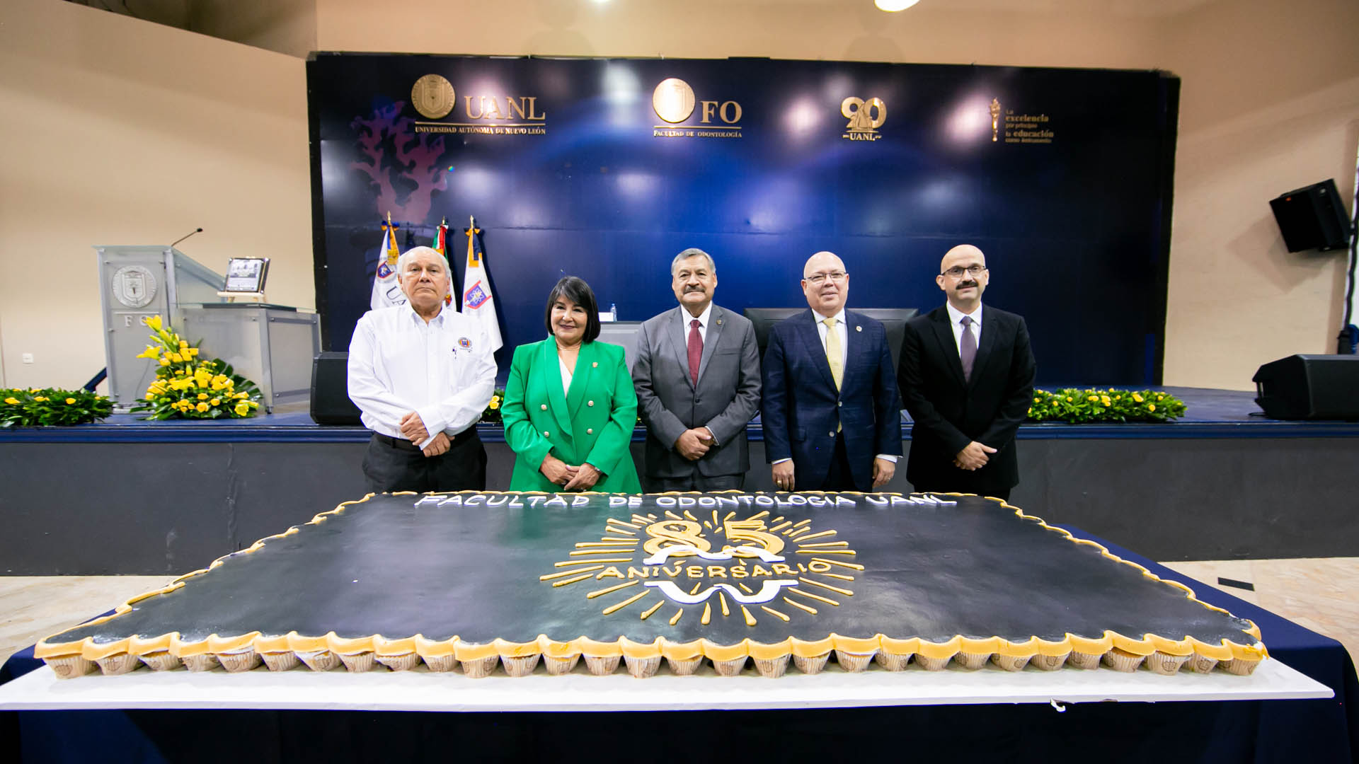 El Rector de la Universidad Autónoma de Nuevo León (UANL), Santos Guzmán López, acompañó a la comunidad de la Facultad de Odontología (FO), encabezada por la directora, María Argelia Akemi Nakagoshi Cepeda, a celebrar el 85 aniversario de la fundación de la dependencia.