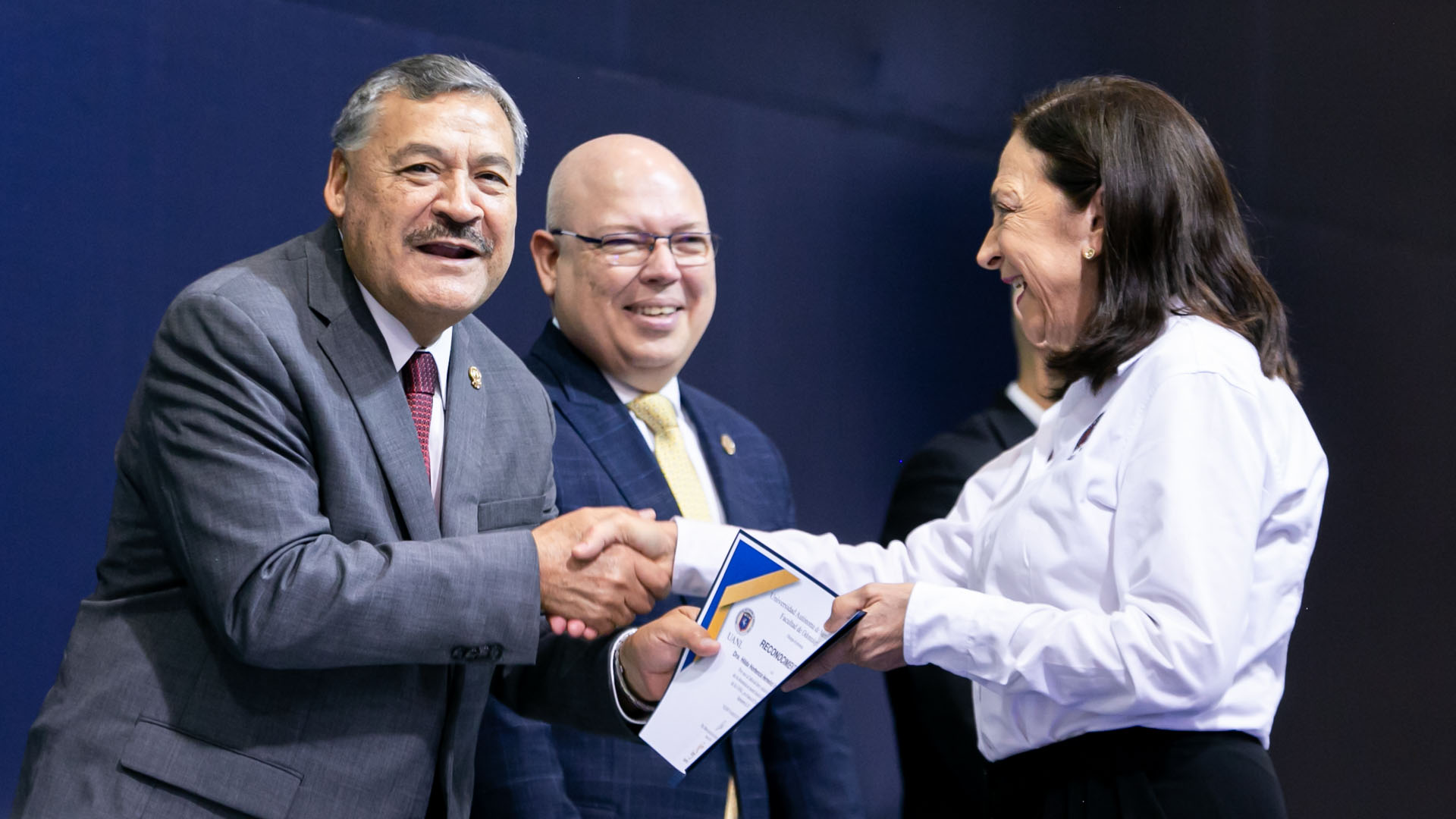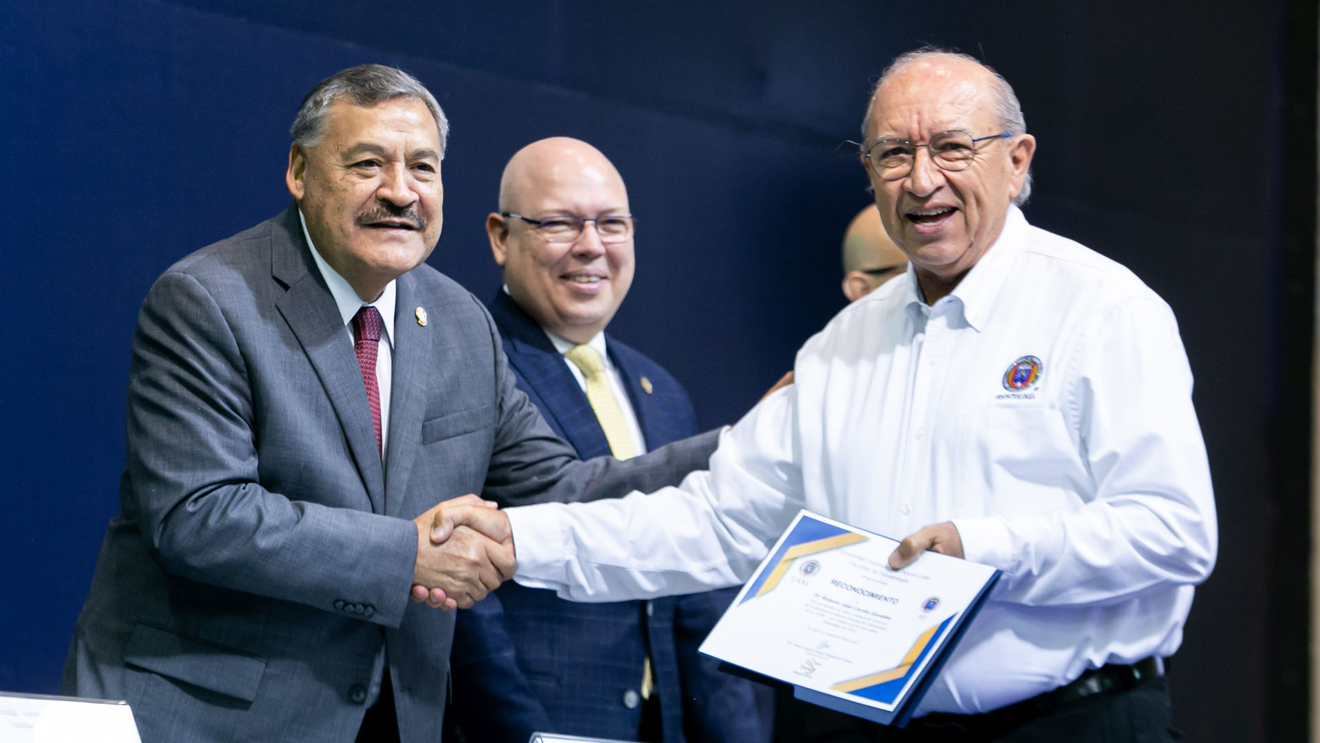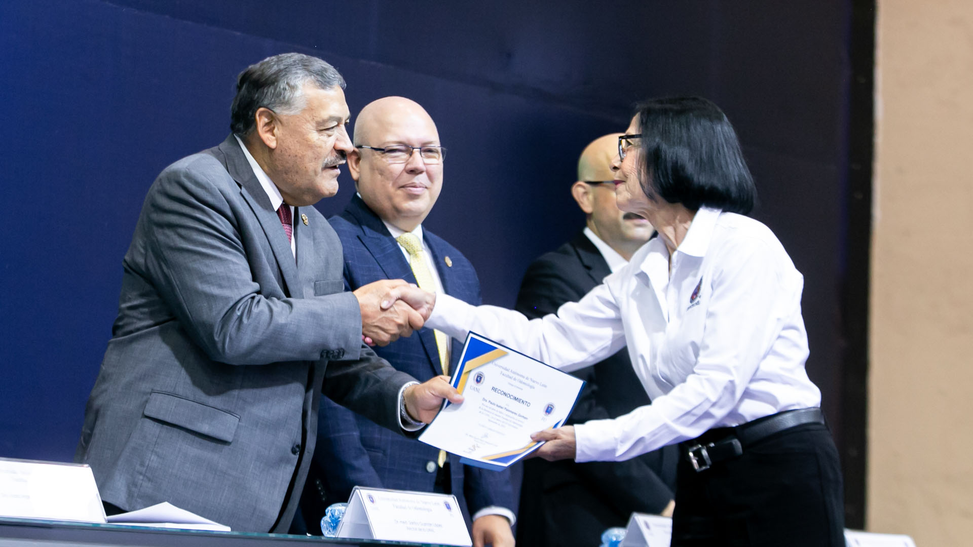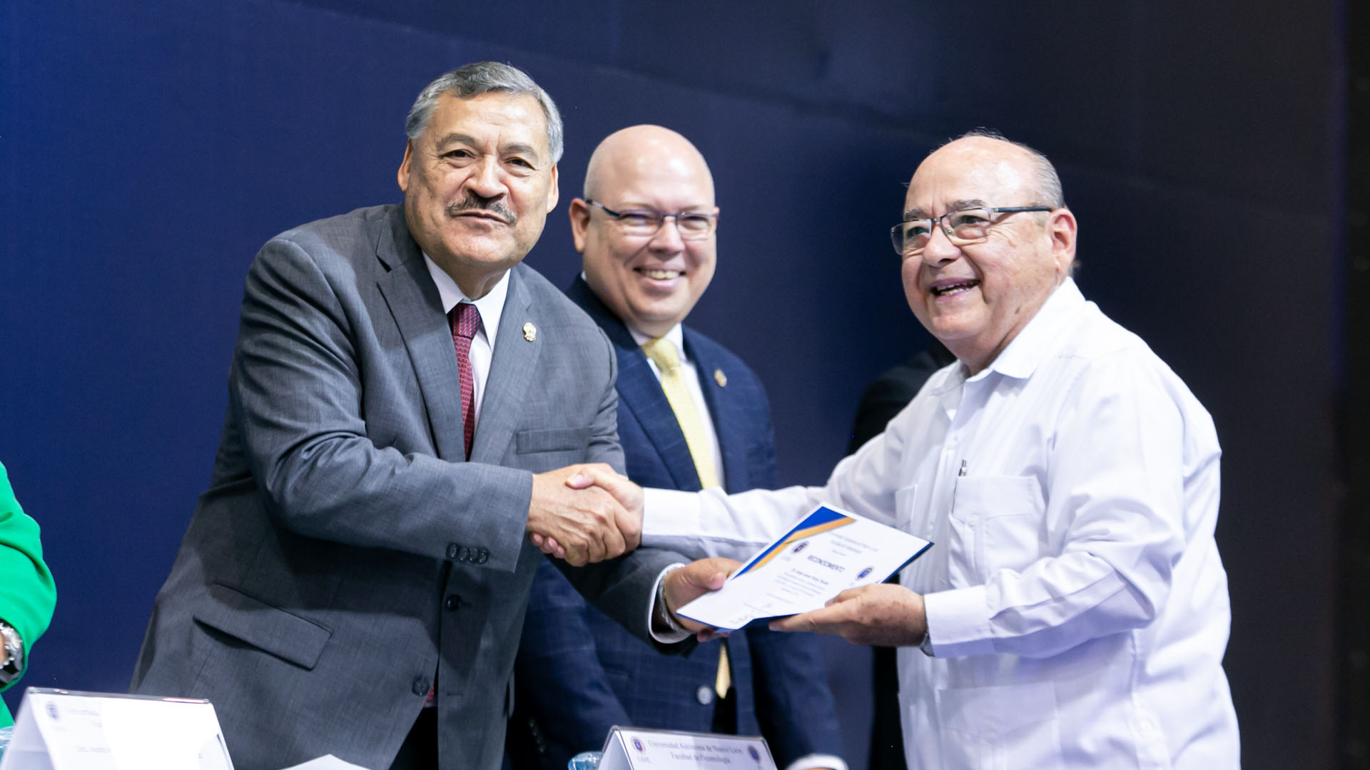 Durante el festejo, realizado en el centro de convenciones de la dependencia, Guzmán López entregó reconocimientos a los docentes de la facultad que han estado en las aulas por más de cuarenta años, destacando los maestros decanos Manuel Guadalupe González Gil y Francisco Ángel Fernández Valbuena por 52 años entregados a la docencia.