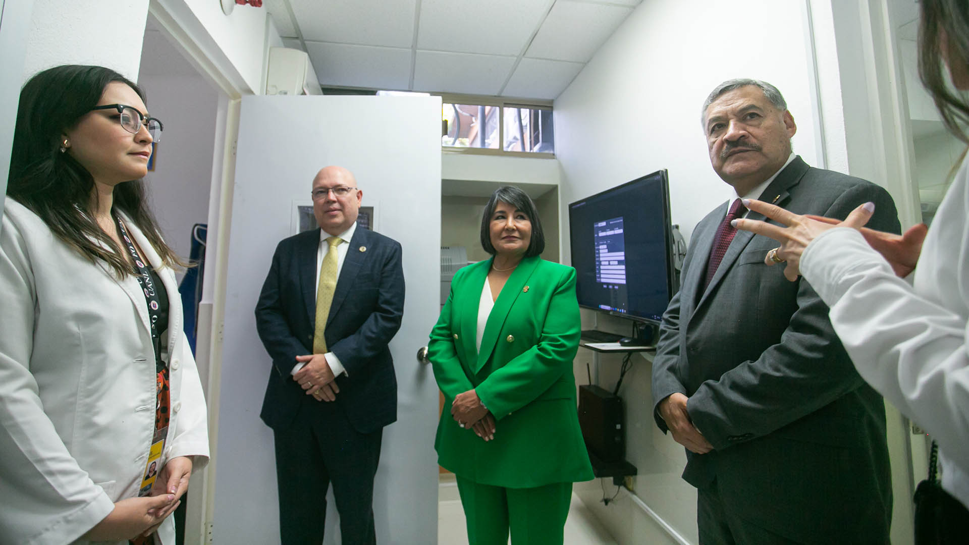 Posteriormente, el Rector y la directora de la FO se dirigieron al departamento de Rayos X, donde la Jefa de la Clínica, Adriana Laura García Villanueva, explicó el uso del Cone Beam o CBCT (Cone Beam Computed Tomography), equipo recientemente adquirido por la facultad que permite el examen de tejidos calcificados, de hueso y de los dientes.