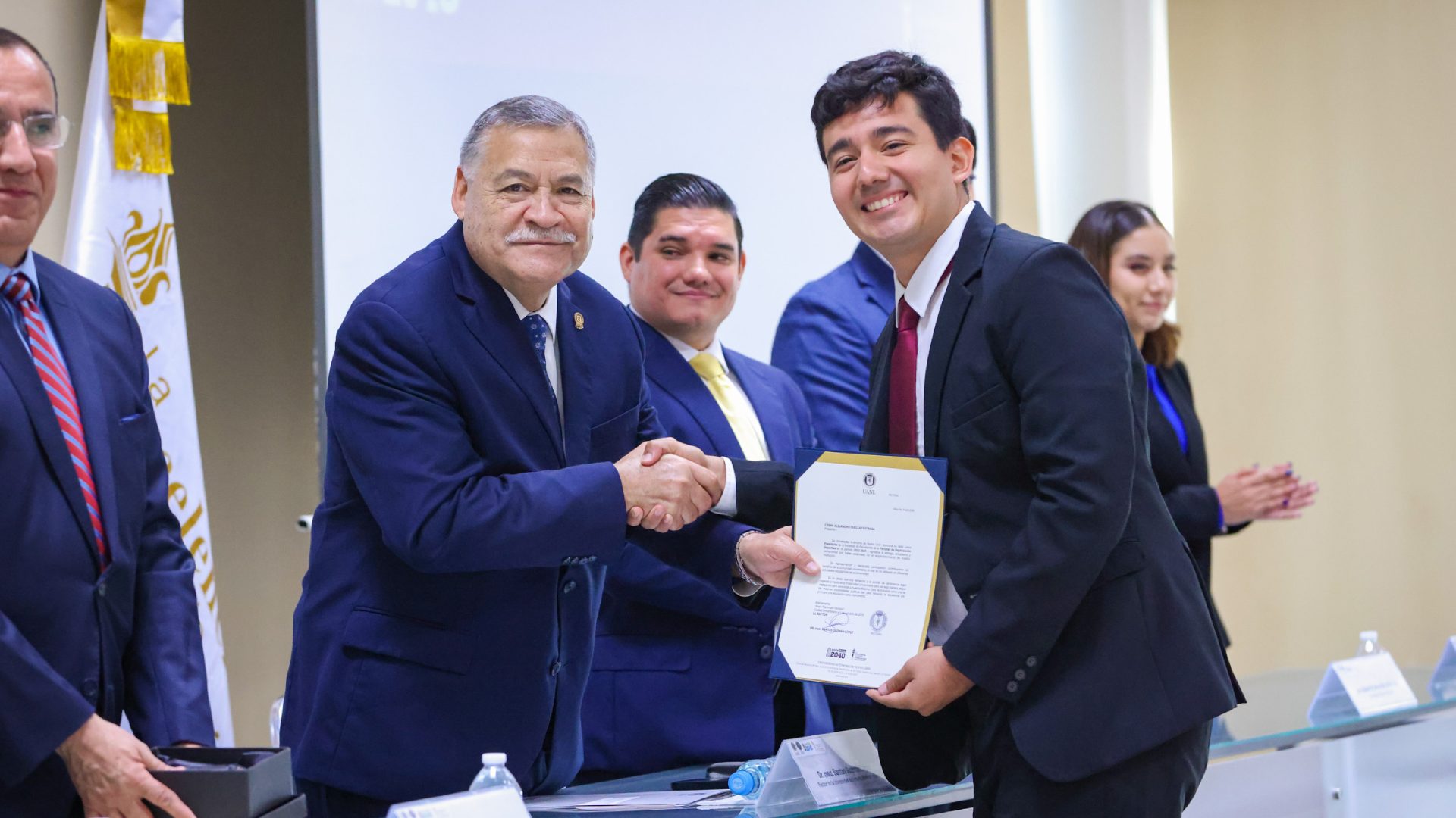 En un ambiente de unidad y compromiso universitario, el Rector de la Universidad Autónoma de Nuevo León, Santos Guzmán López, presidió la toma de protesta de la nueva mesa directiva de la Sociedad de Alumnos de la Facultad de Organización Deportiva (FOD), en ceremonia realizada en la Sala Polivalente 3 de la dependencia.