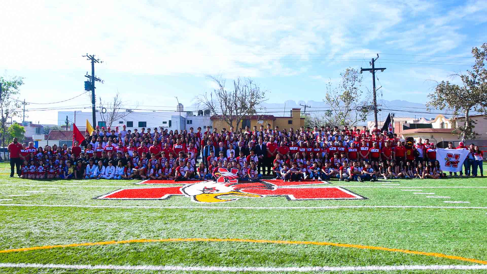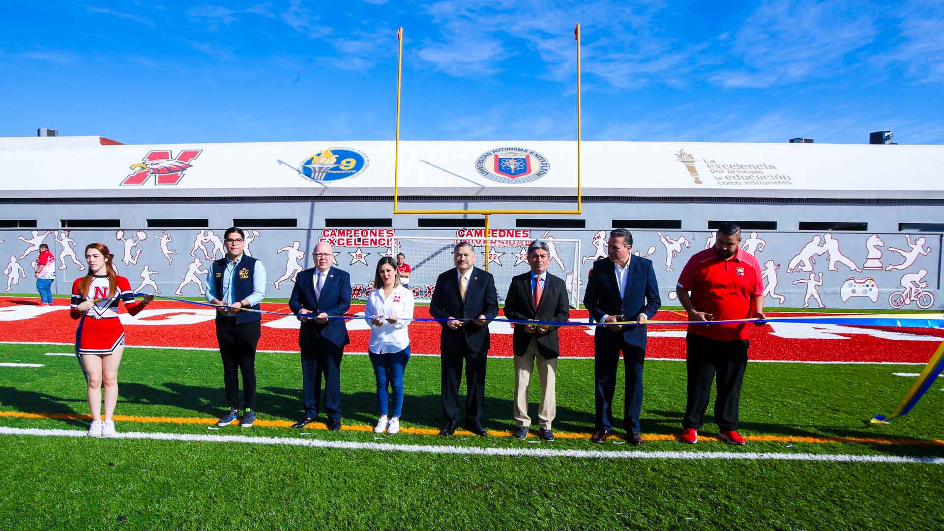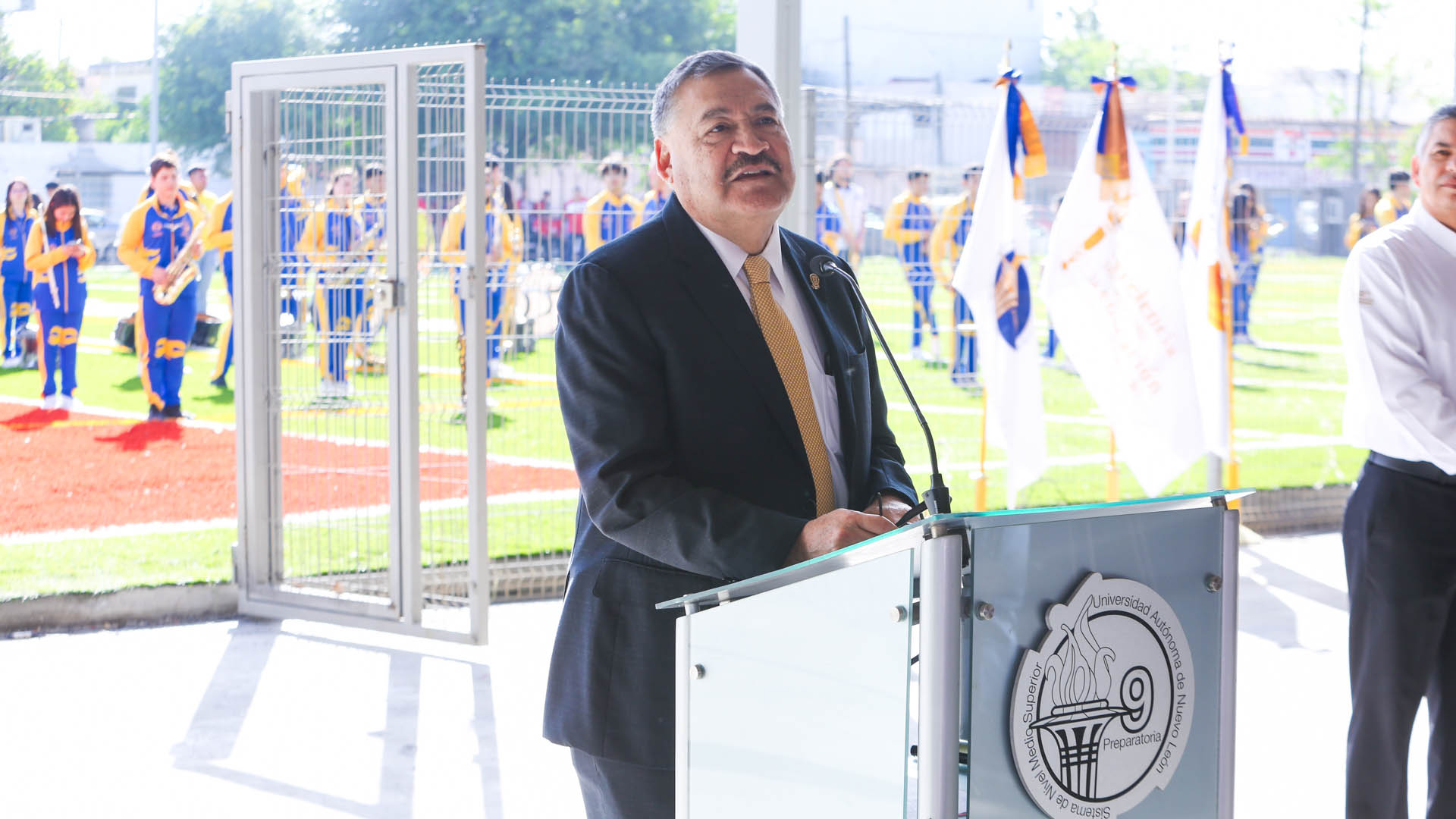 El Rector de la Universidad Autónoma de Nuevo León, Santos Guzmán López, dio el kick off de la remodelada cancha polideportiva de la Preparatoria 9, instalación que beneficiará a todo el alumnado de las Águilas, ya que podrán realizar sus entrenamientos y encuentros con la comodidad que brinda el pasto sintético.