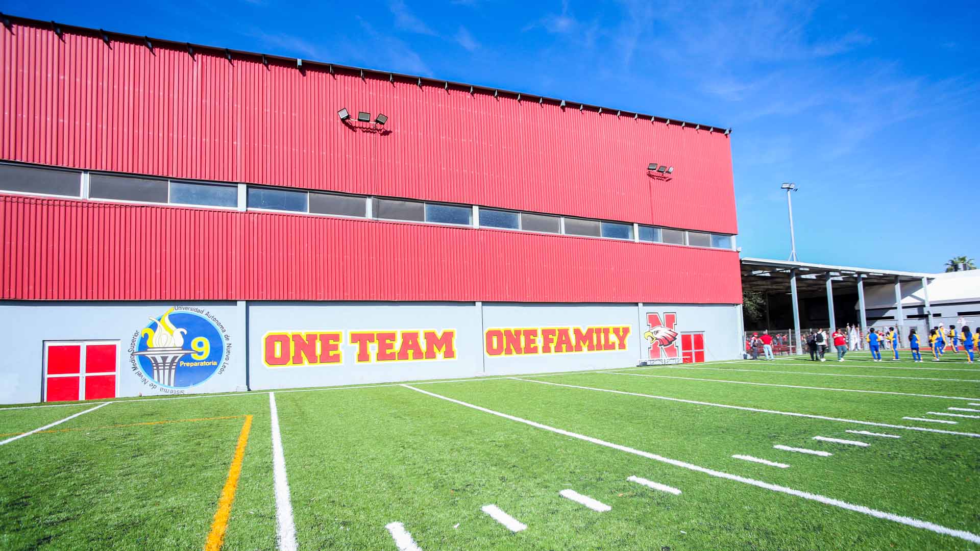 La cancha polideportiva de la Preparatoria 9 mide 3,228 metros cuadrados (46 yardas de ancho por 70 yardas de largo) y cuenta con nuevas porterías y luminarias.