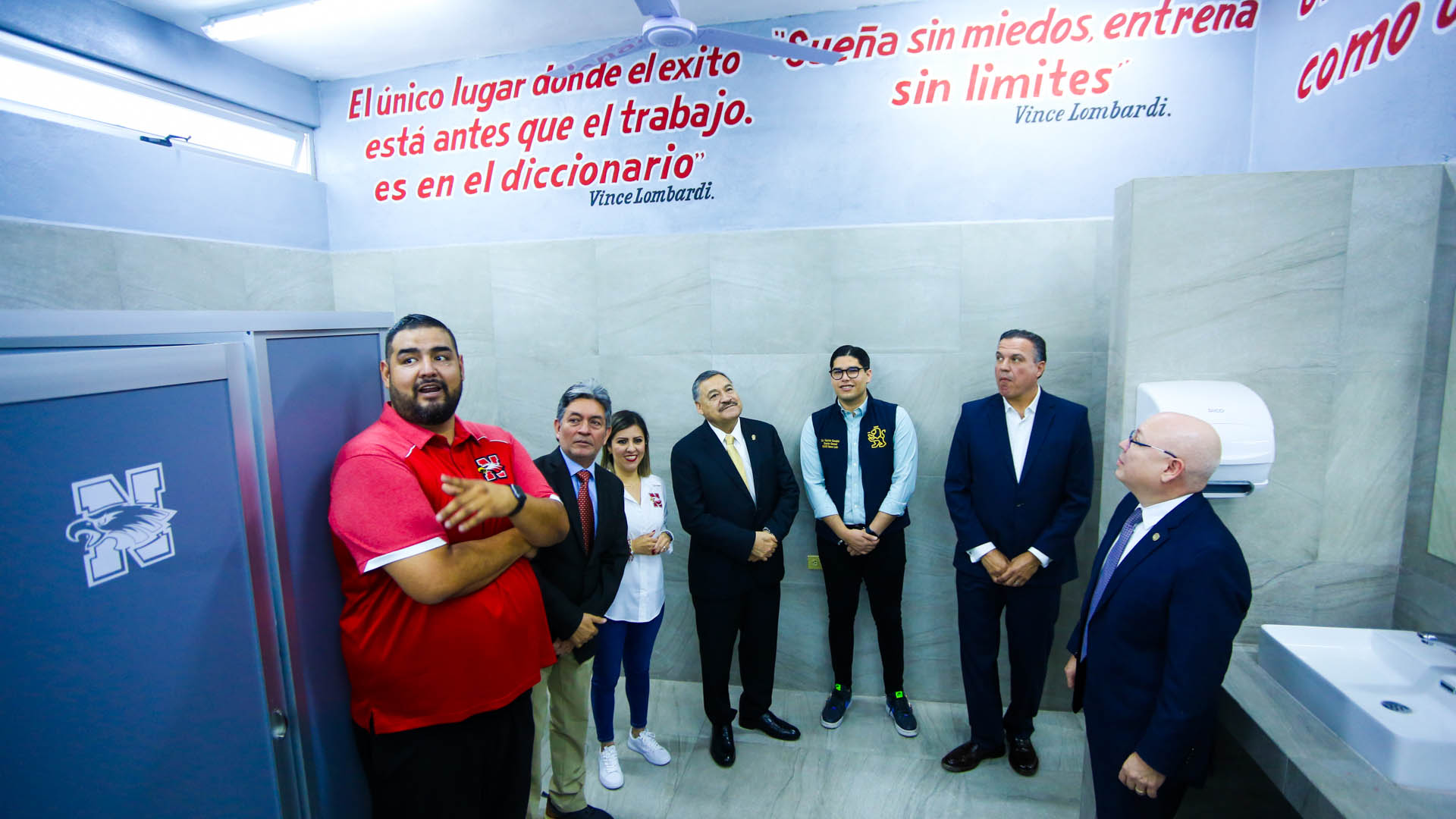 Guzmán López acompañó a la directora de la dependencia universitaria, Claudia Jeanneth García Dueñas, en un recorrido por el área deportiva de la Preparatoria 9, donde develó la placa conmemorativa de la remodelación, que también incluye los baños vestidores que utilizarán los equipos locales y visitantes.
