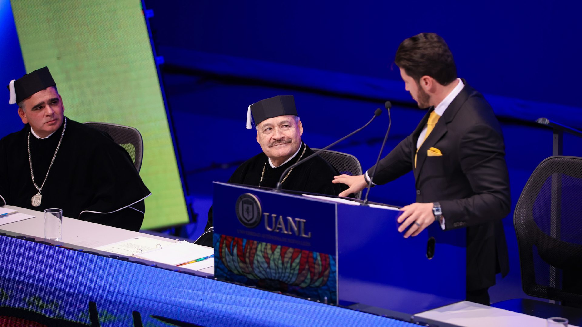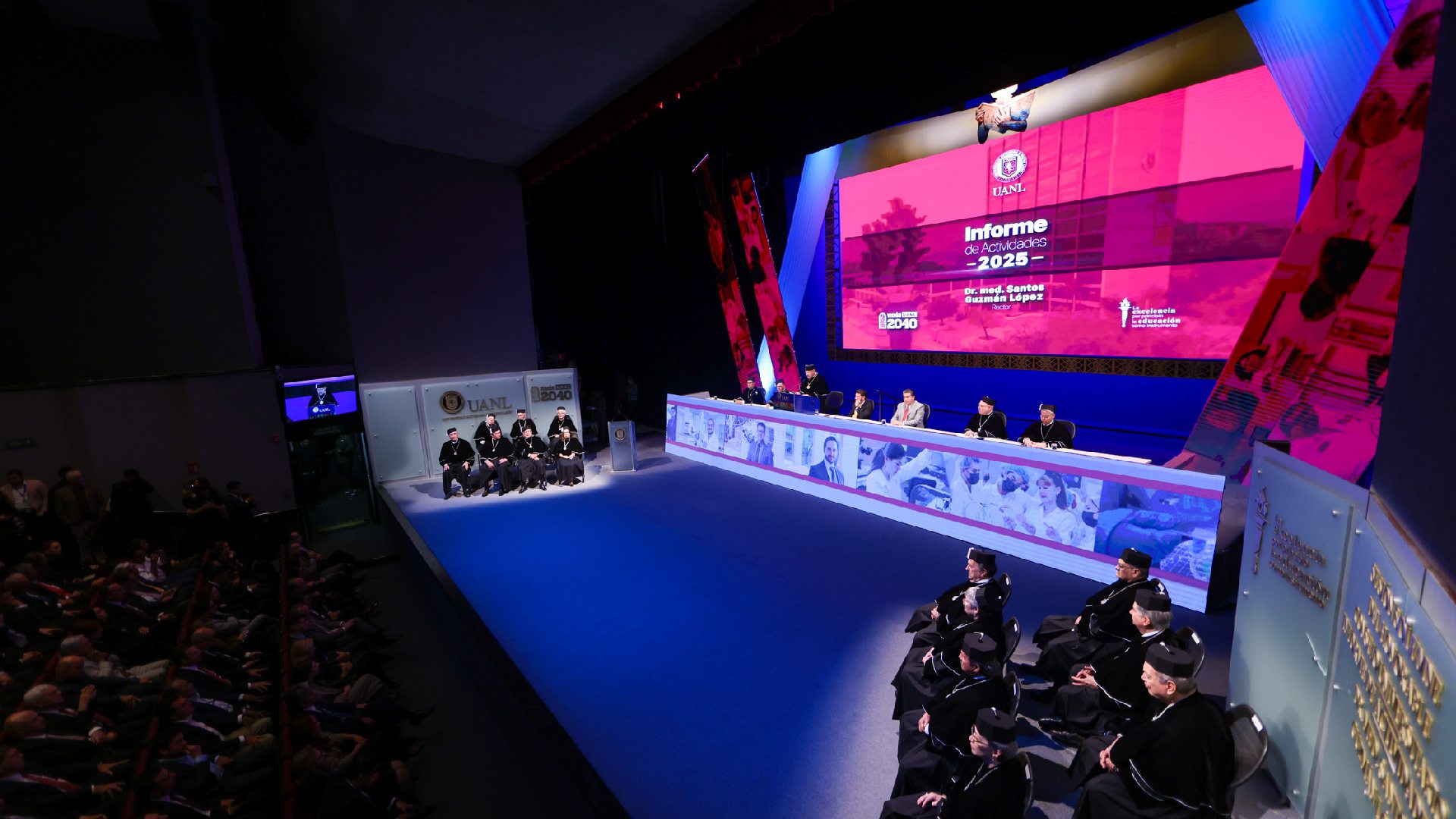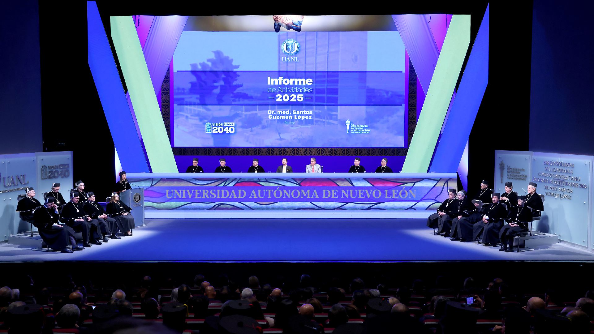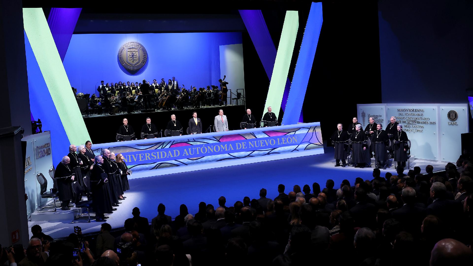 El Rector de la Universidad Autónoma de Nuevo León (UANL), Santos Guzmán López, rindió su informe de las actividades realizadas en el periodo comprendido del 28 de octubre de 2024 al 27 de octubre de 2025 durante la Sesión Solemne del H. Consejo Universitario del 30 de octubre.