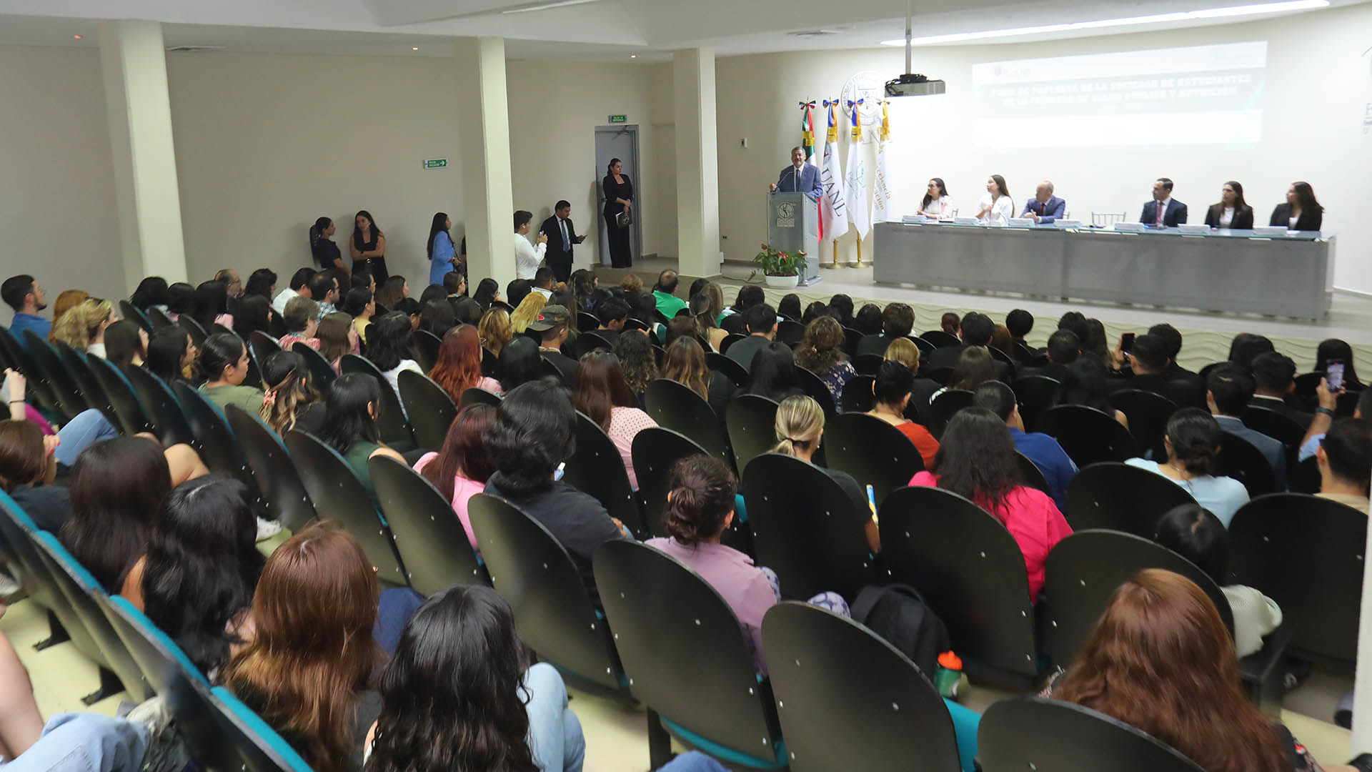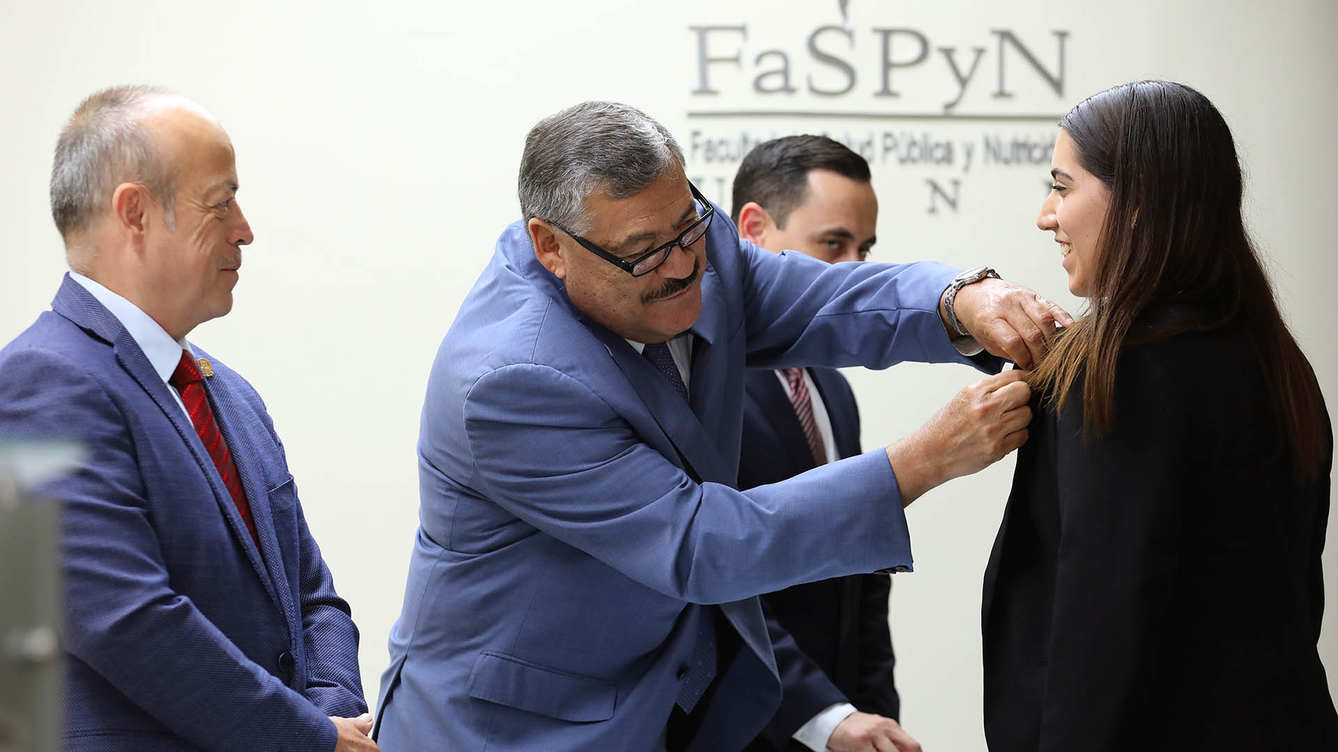 La ceremonia se llevó a cabo en el Auditorio Fundadores de la facultad y estuvieron presentes, además de Guzmán López, Manuel López Cabanillas Lomelí, director de la dependencia; Rolando Hernández Salazar, director de Actividades Estudiantiles de la UANL; Roberta Romero Garza, consejera alumna saliente, y Gemma de la Paz Gallegos Martínez, presidenta de la sociedad de estudiantes saliente.