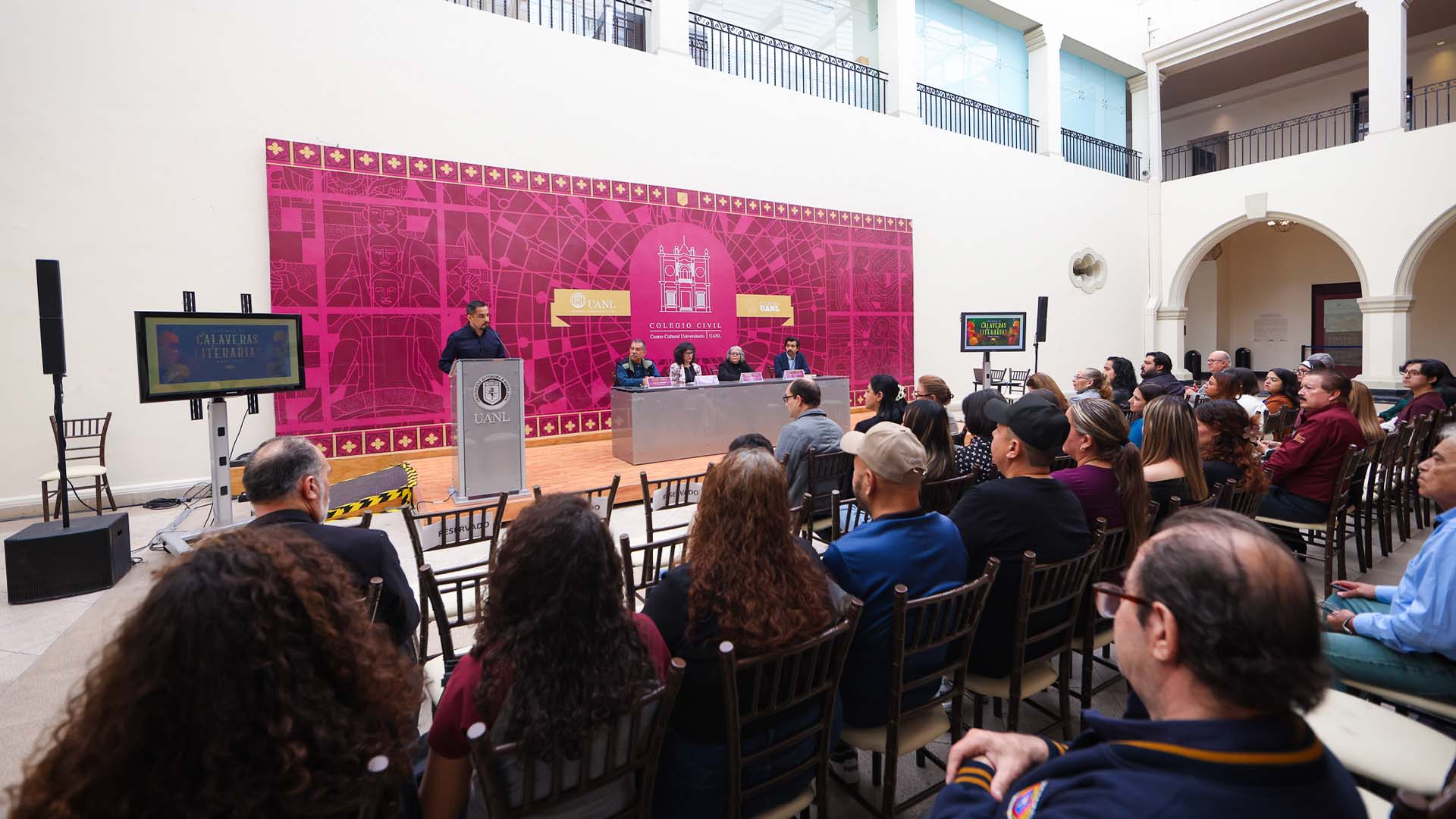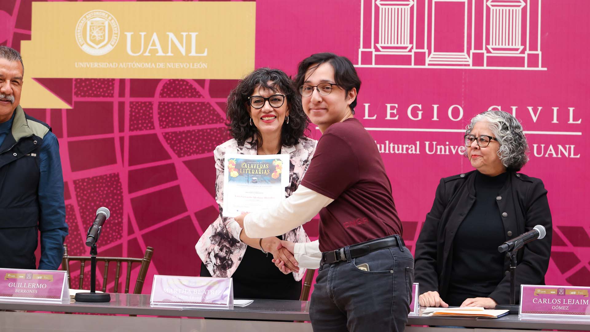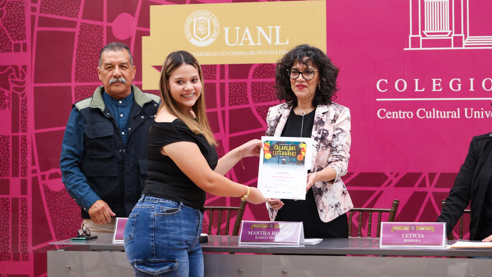 La catrina llegó a Nuevo León con la misión de llevarse a universitarios. Deportistas, secretarias, dentistas y uno que otro despistado fueron blanco de sus tretas en la edición del Certamen de Calaveras Literarias 2025 de la Universidad Autónoma de Nuevo León, cuya premiación se llevó a cabo el 29 de octubre en el Patio Ala Sur del Colegio Civil Centro Cultural Universitario.