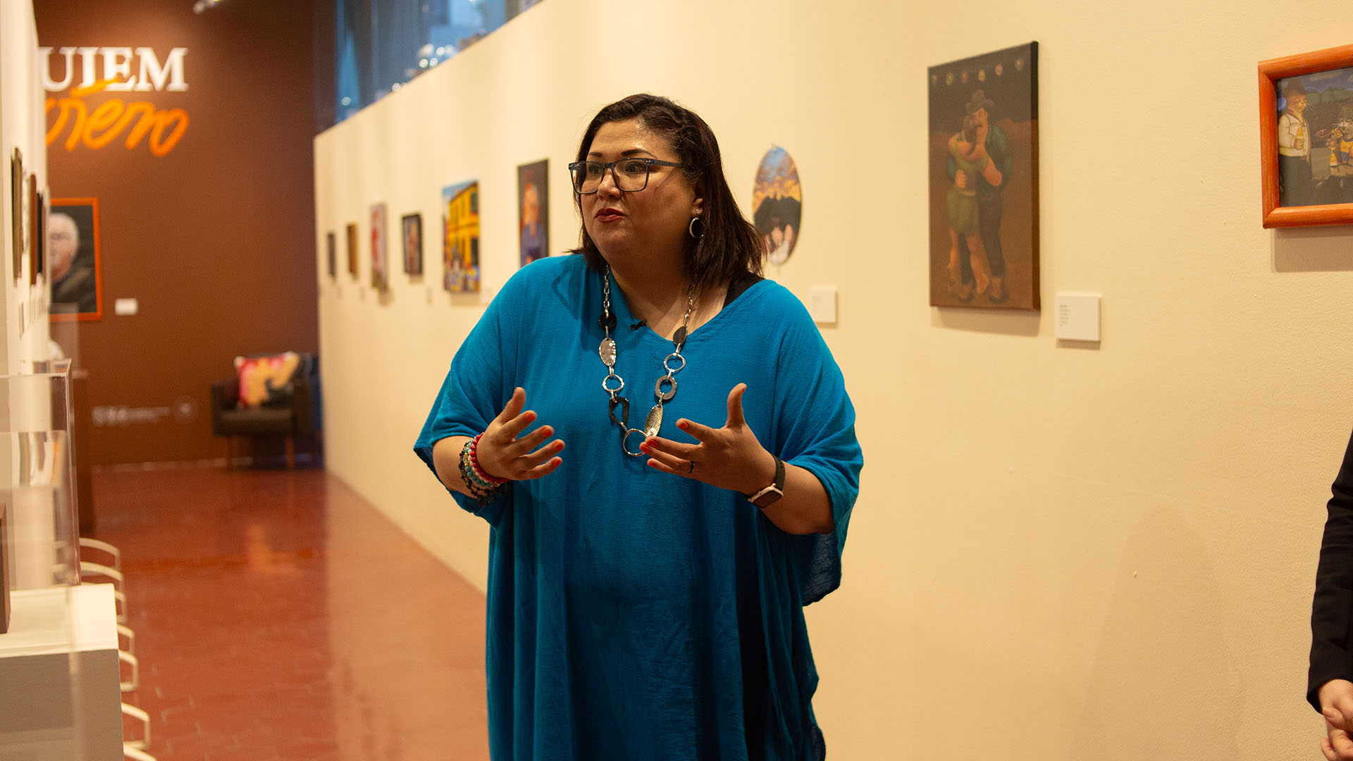 La catedrática Celeste Flores realizó un tour con los presentes para explicar la exposición más a fondo. Entre los temas propuestos por los estudiantes destaca el empoderamiento femenino y la presencia de la mujer en la sociedad.