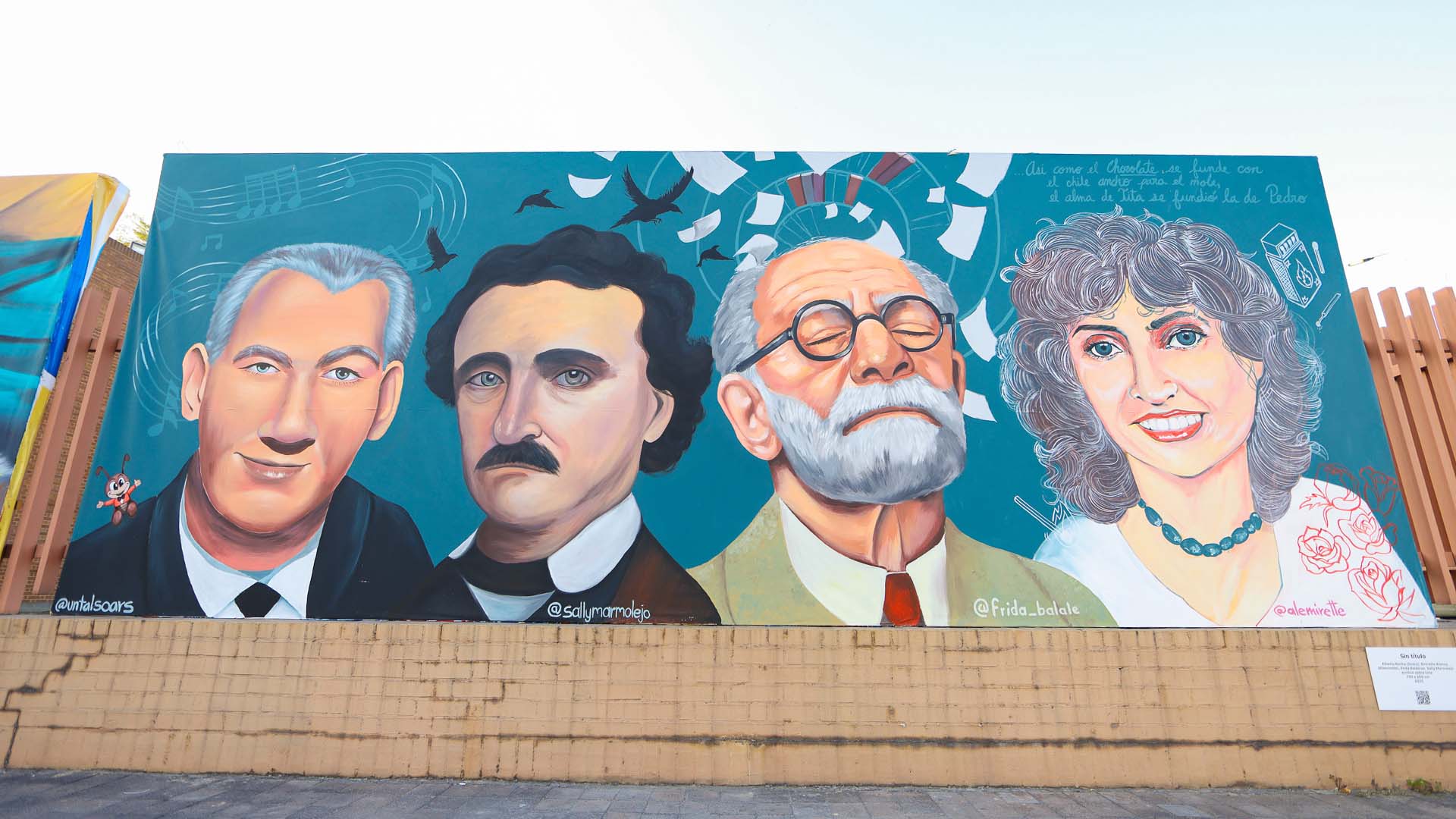 Un total de seis murales de diversas temáticas que fusionan la literatura con la pintura adornan la fachada principal de la biblioteca universitaria. Todos ellos toman como inspiración obras literarias que van de El Principito de Antoine de Saint-Exupéry a El príncipe feliz de Oscar Wilde.
