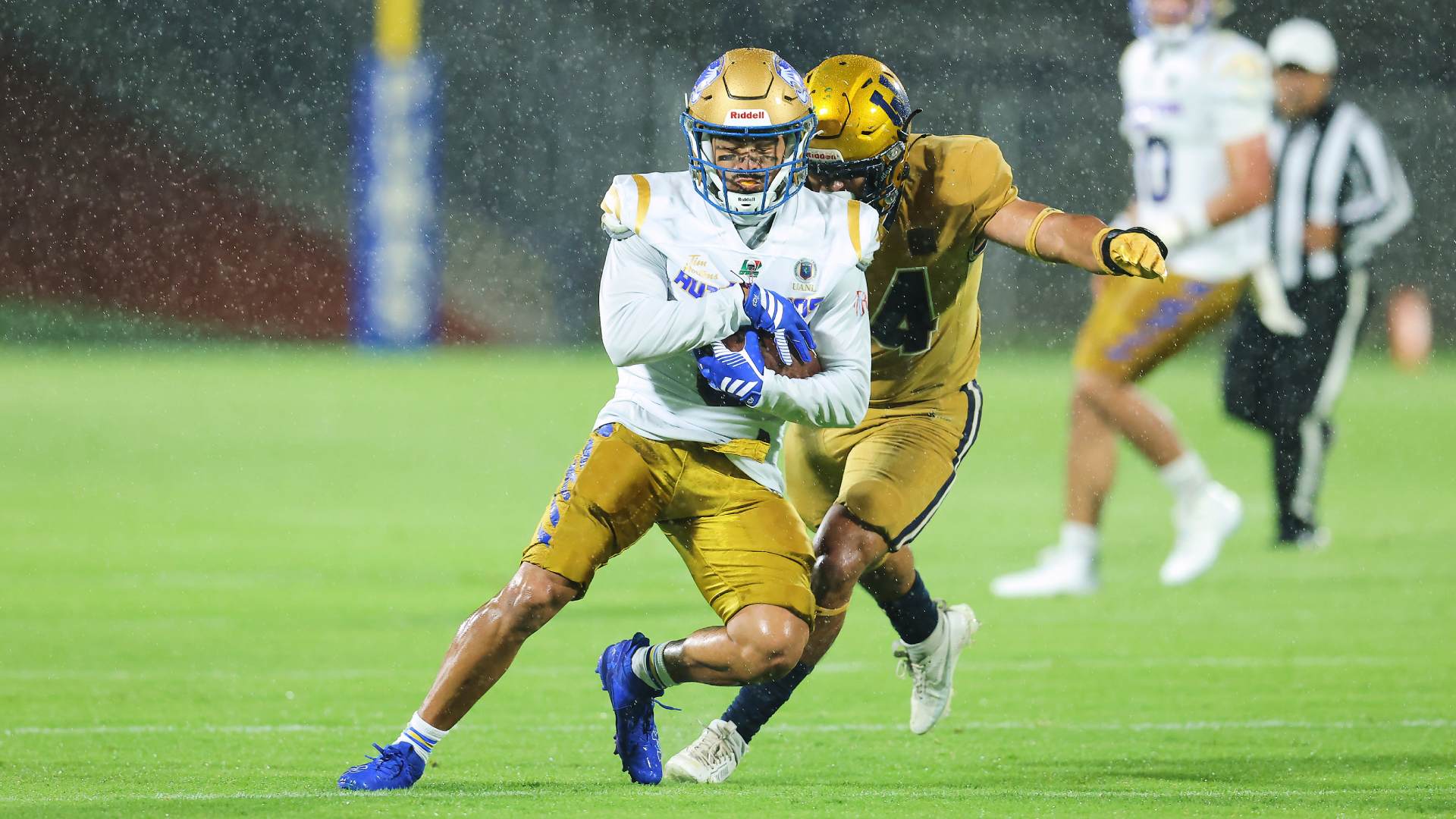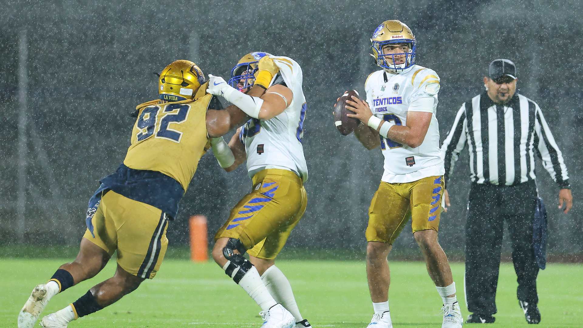 El juego entre los Auténticos Tigres y los Pumas estuvo acompañado de una fuerte lluvia sobre el emparrillado del Estadio Olímpico Universitario. El clima adverso provocó errores en ambos equipos, como dos pases incompletos de Pumas, a pesar de que los receptores no tenían marcación.